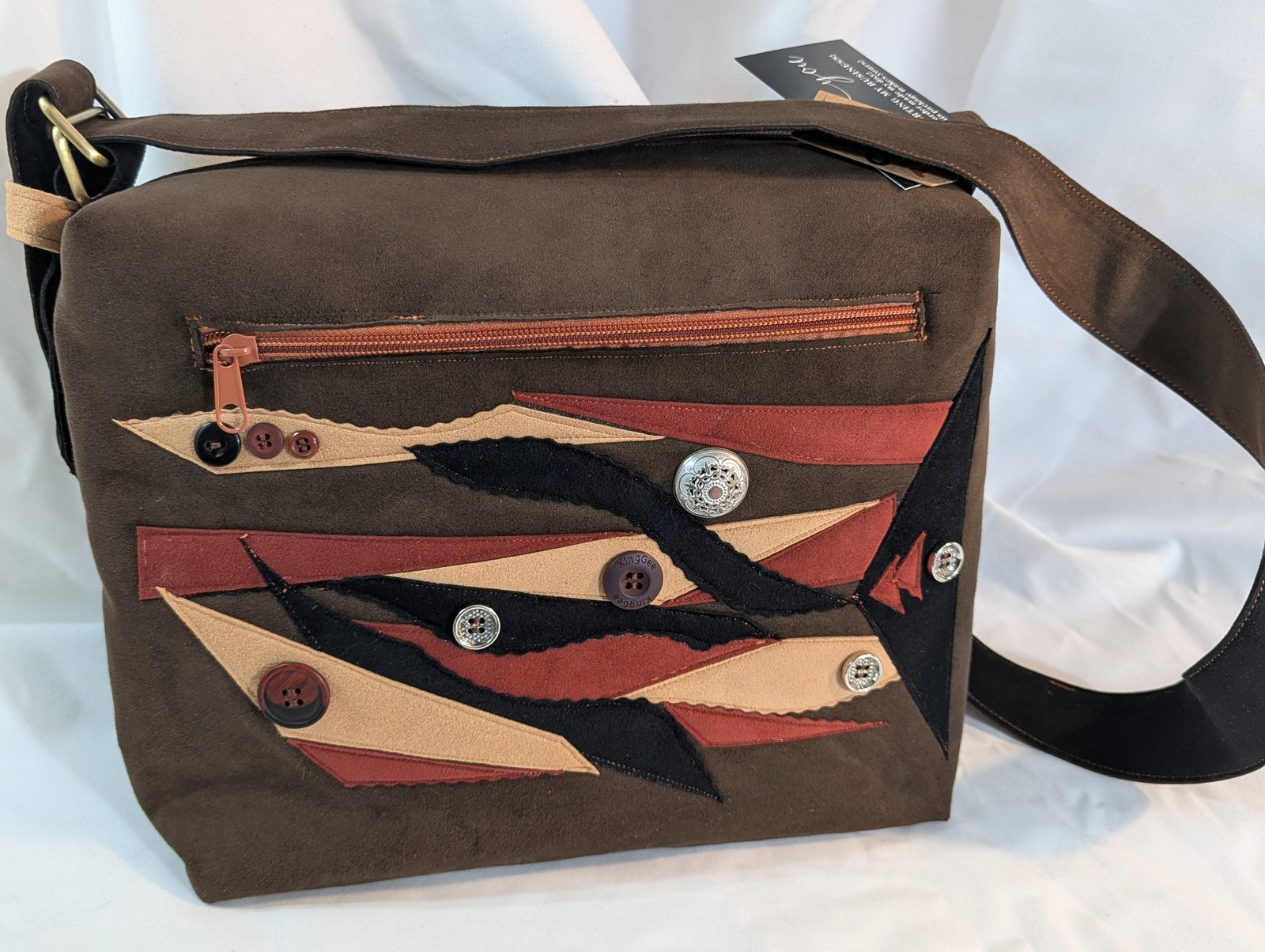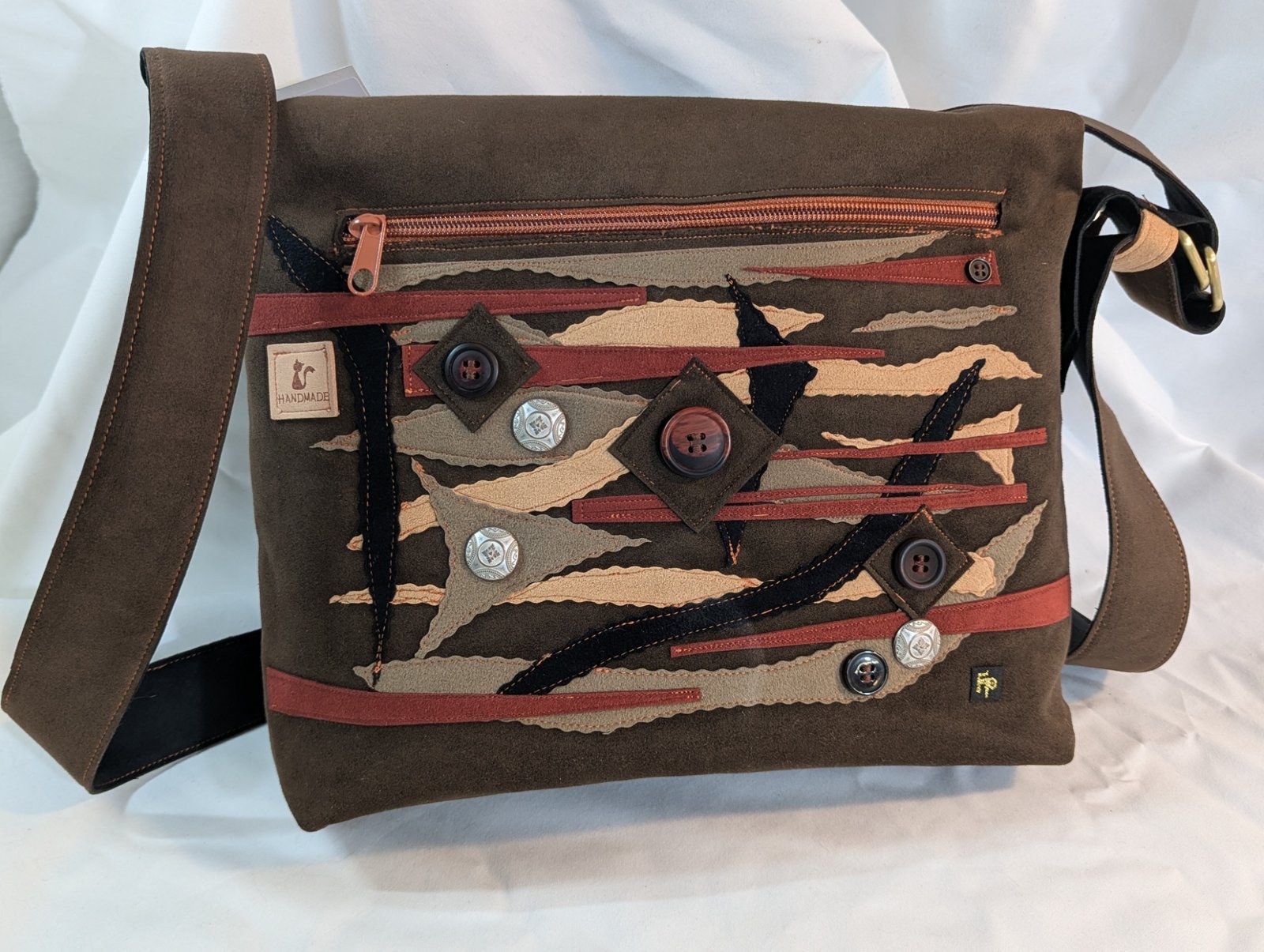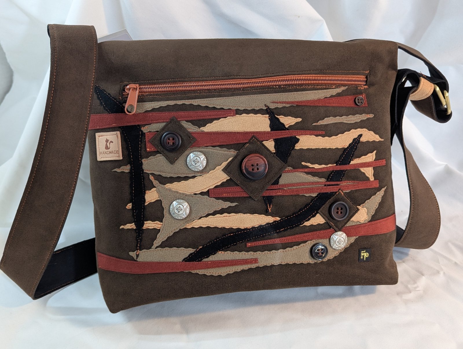 Ultrasuede, fabric appliqué, metal hardware, satin lining