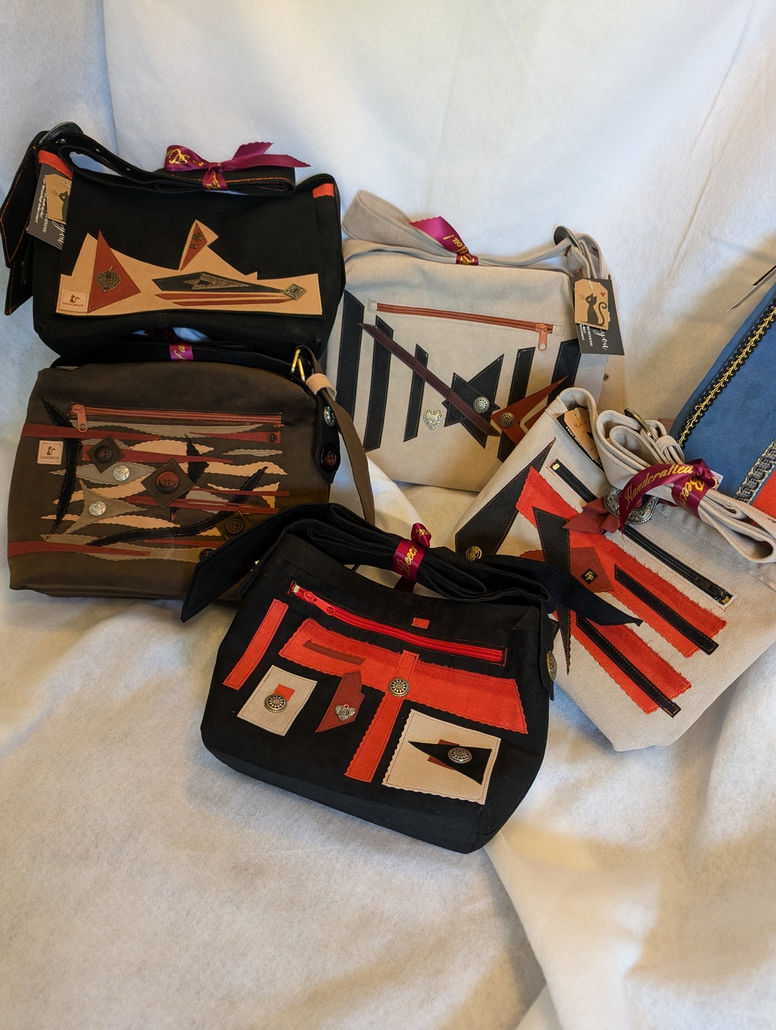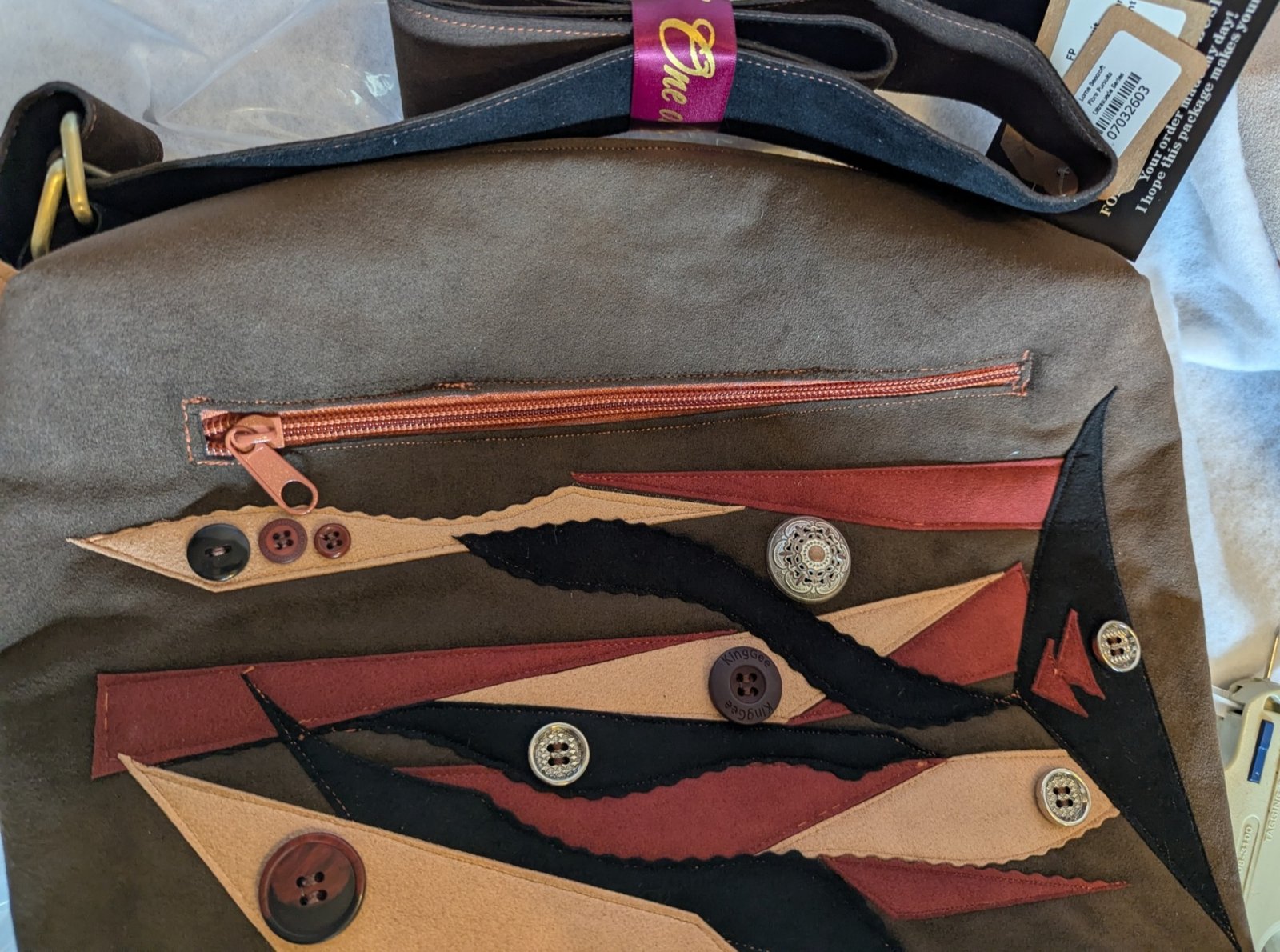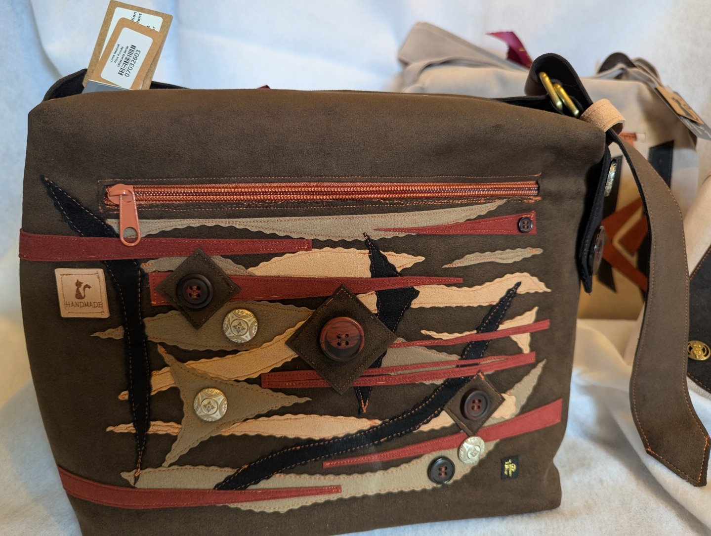 Ultrasuede, fabric appliqué, metal hardware, satin lining