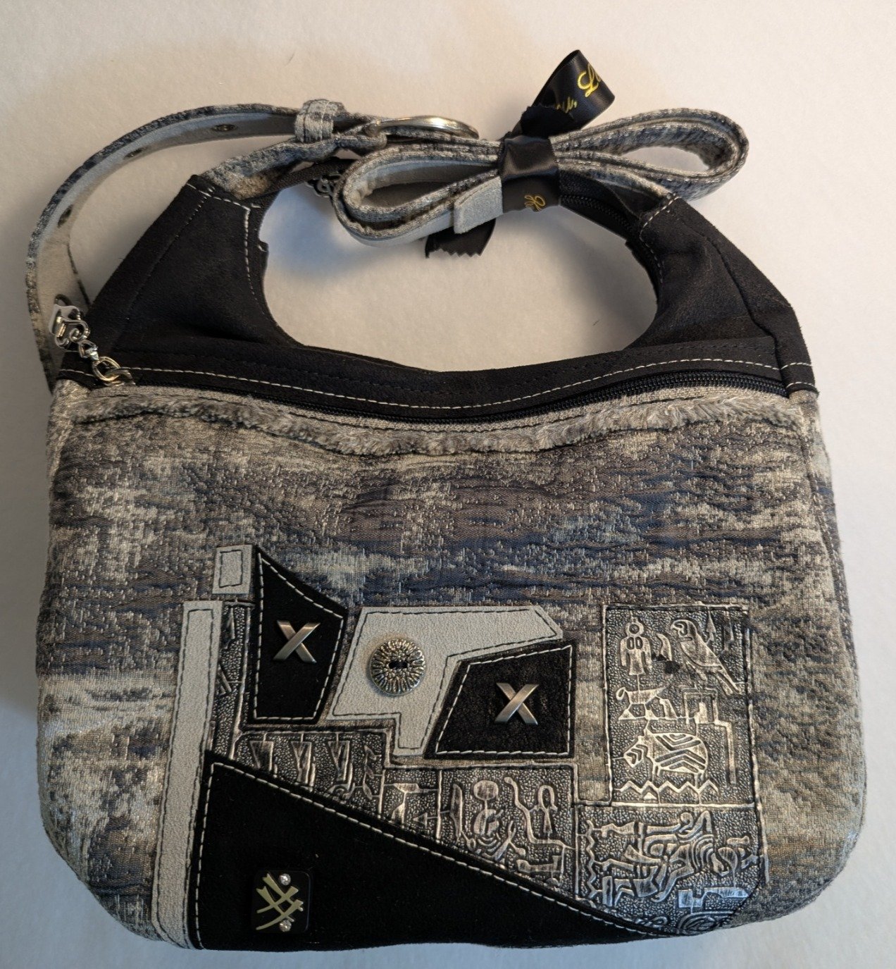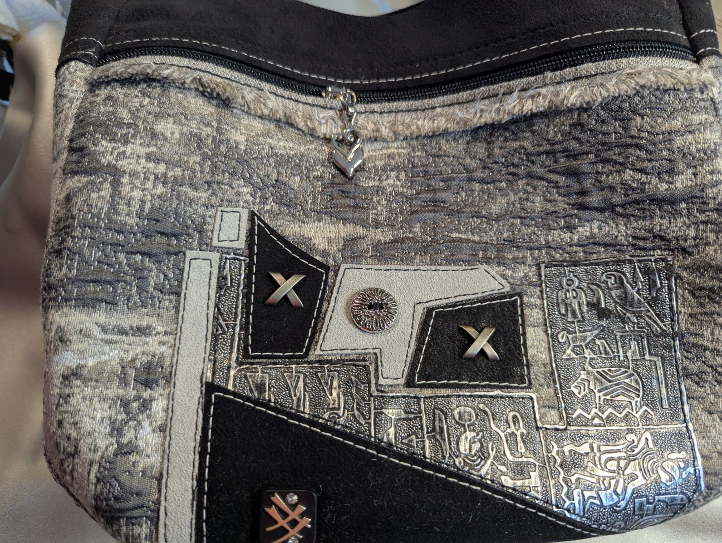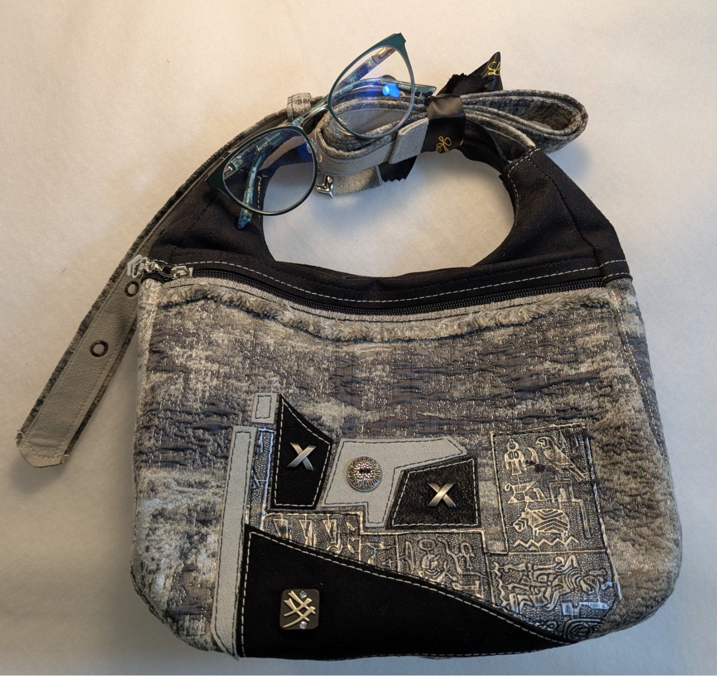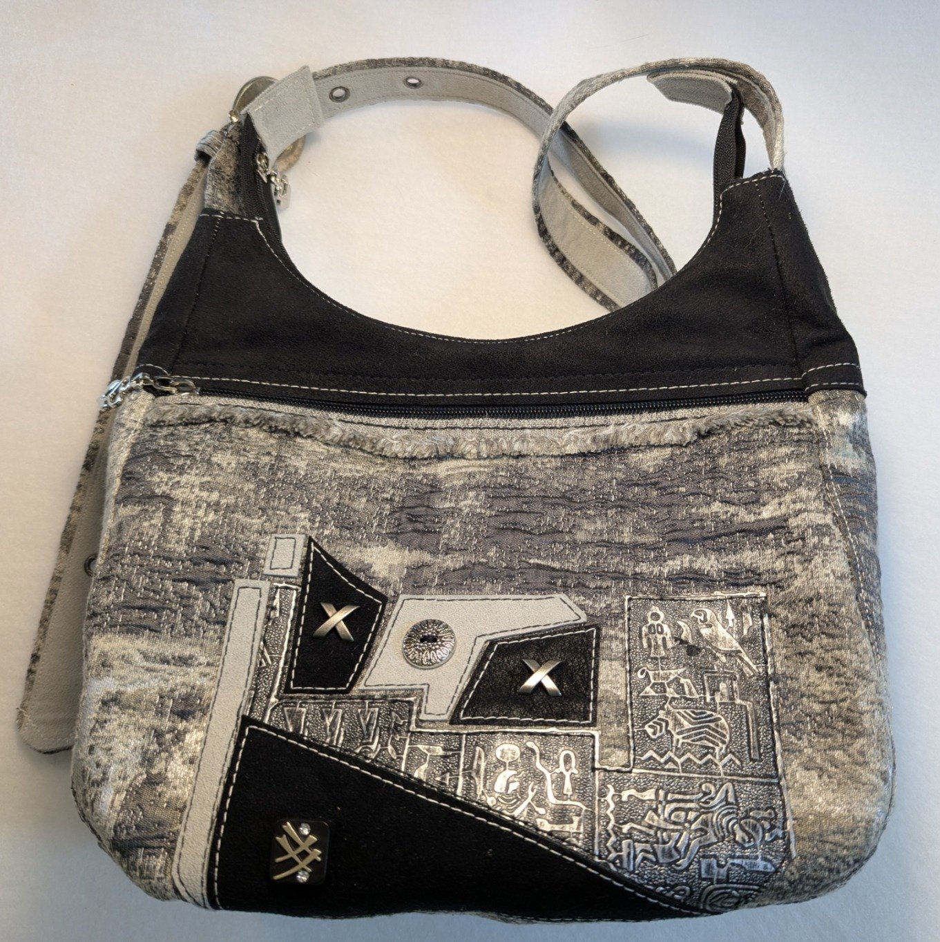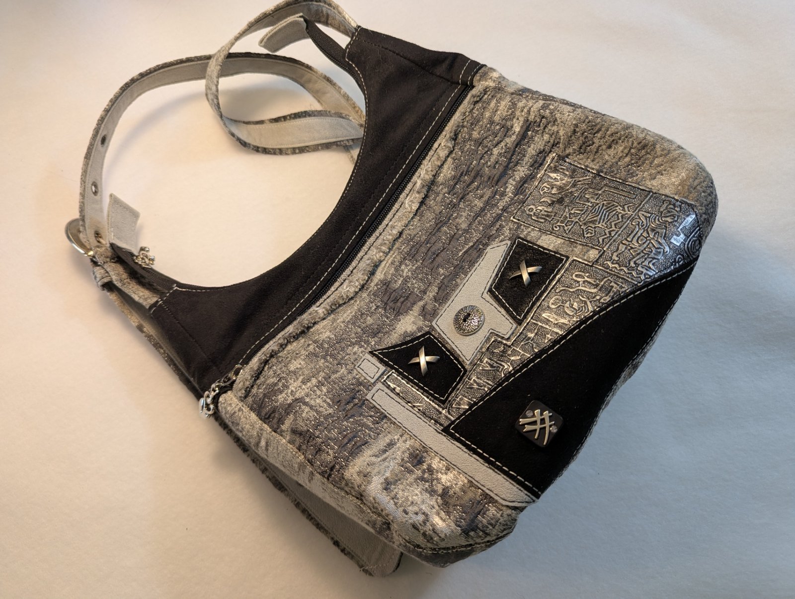 Echoes in Silver is a distinctive handmade bag designed to combine artistic surface design with everyday usability. Created in richly textured silver-toned fabric with black, grey, and metallic-inspired accents, this piece has a refined, modern feel with a subtle echo of ancient carved surfaces and geometric form.