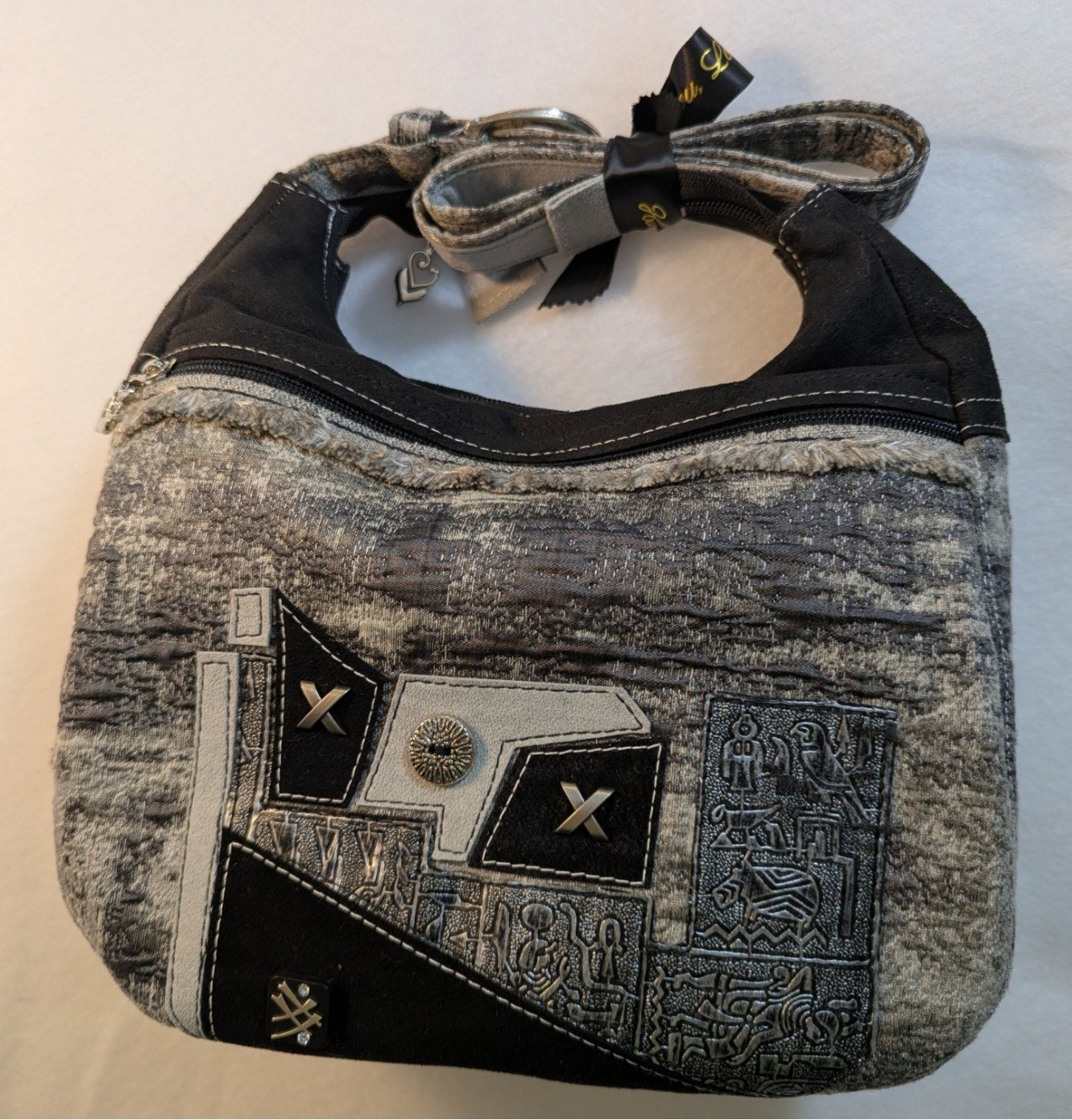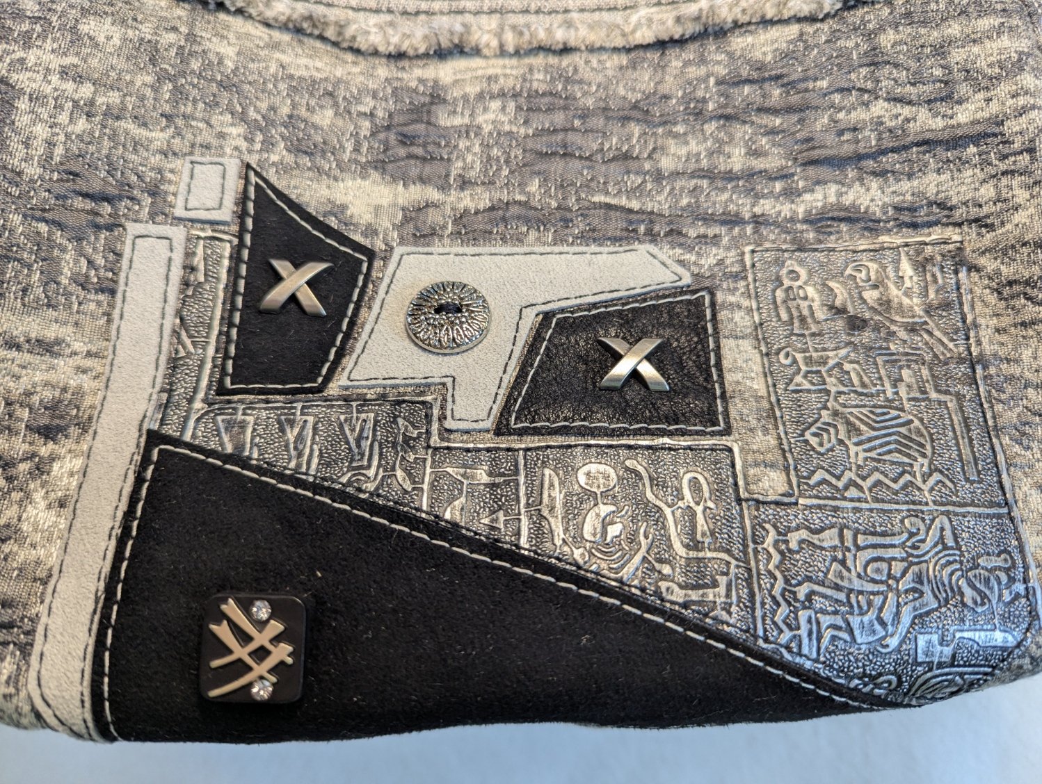 Created in richly textured silver-toned fabric with ultrasuede and faux leather accents, this piece combines layered artistic surface design with thoughtful everyday functionality. The bold front composition gives the bag a strong visual identity, while the satin-lined interior and organized pocket layout make it especially practical to use.