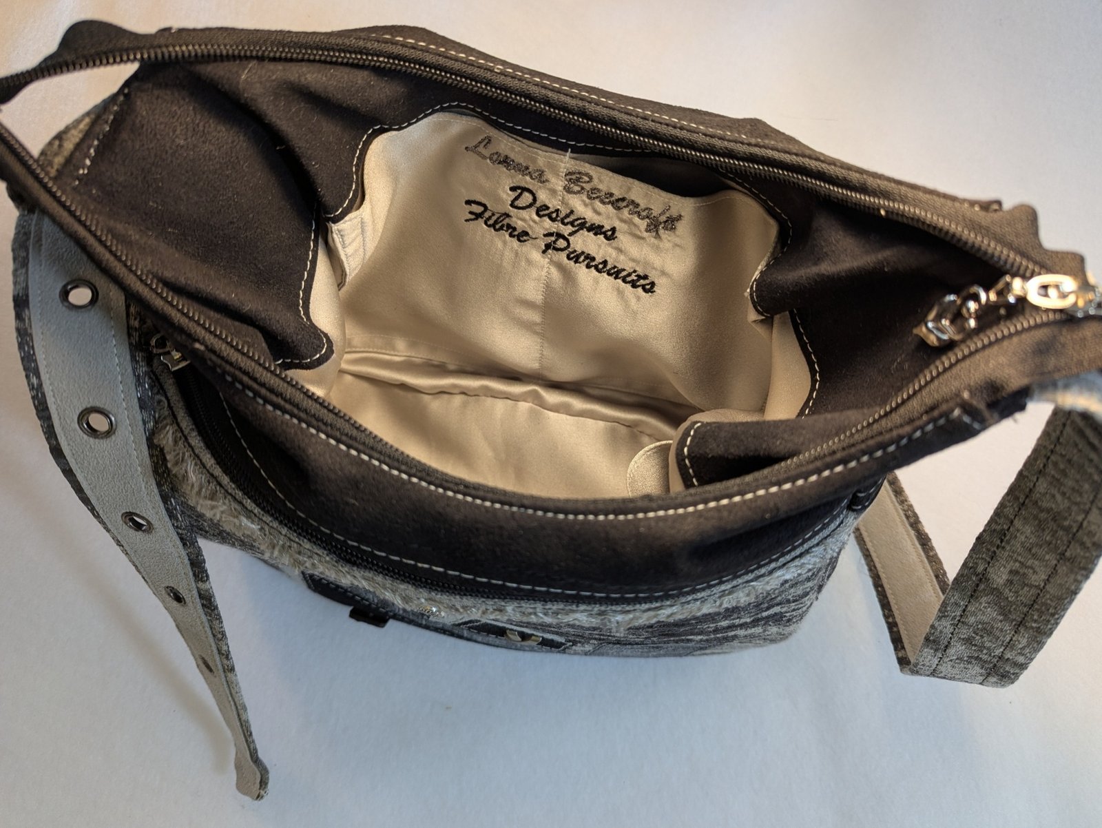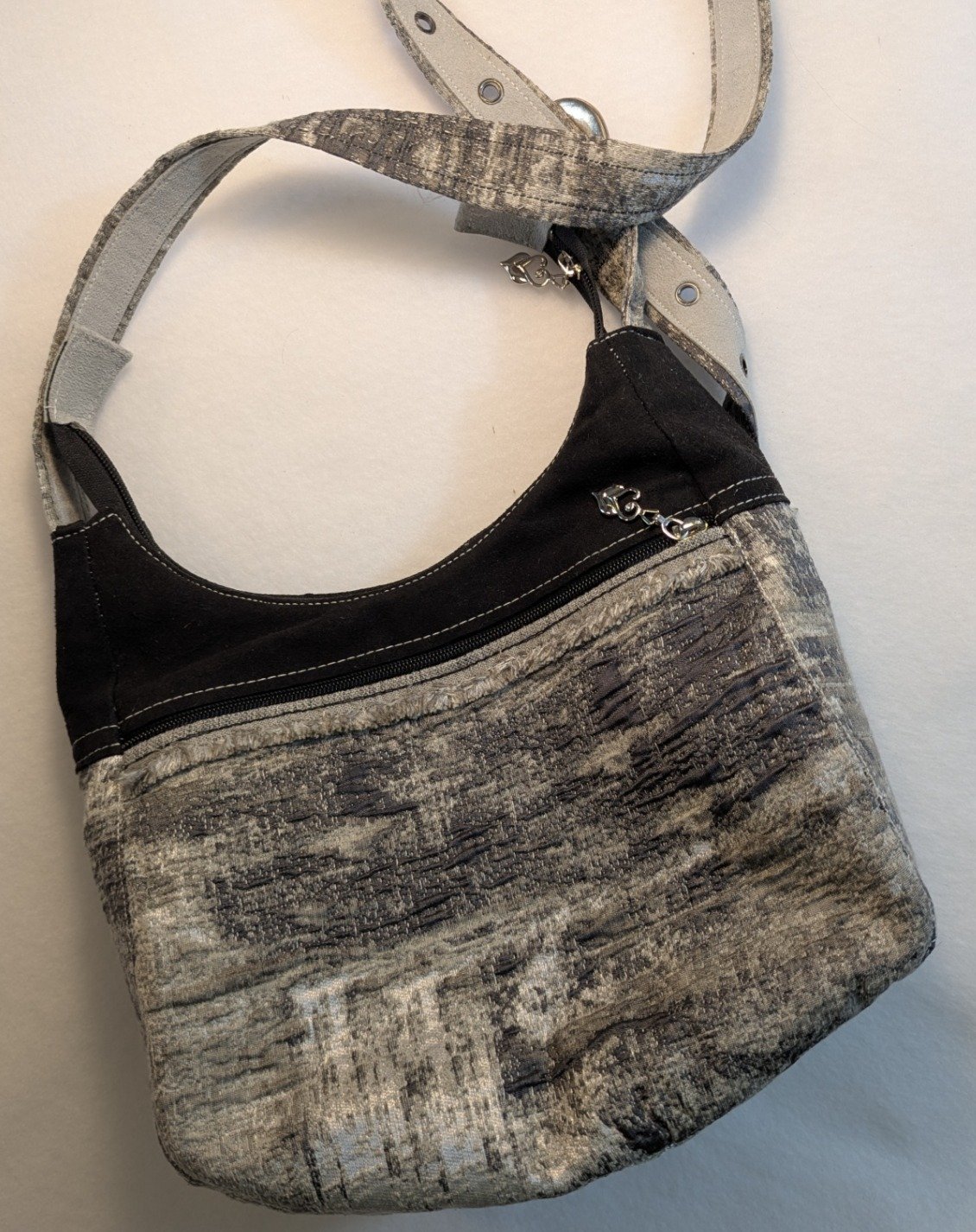 It offers the practicality of an organized everyday bag, while still carrying the visual interest and individuality of a handmade art piece. The silver-toned textile gives it a sophisticated, luminous quality, while the darker accents ground the design and give it structure.