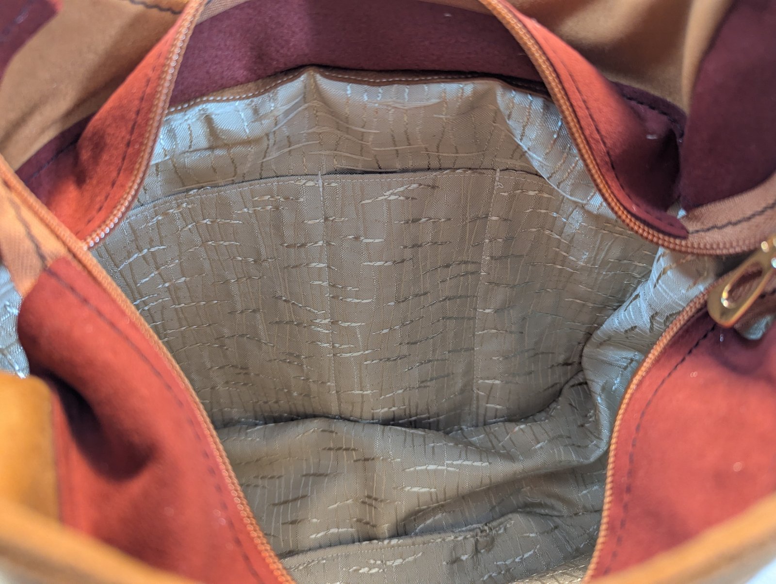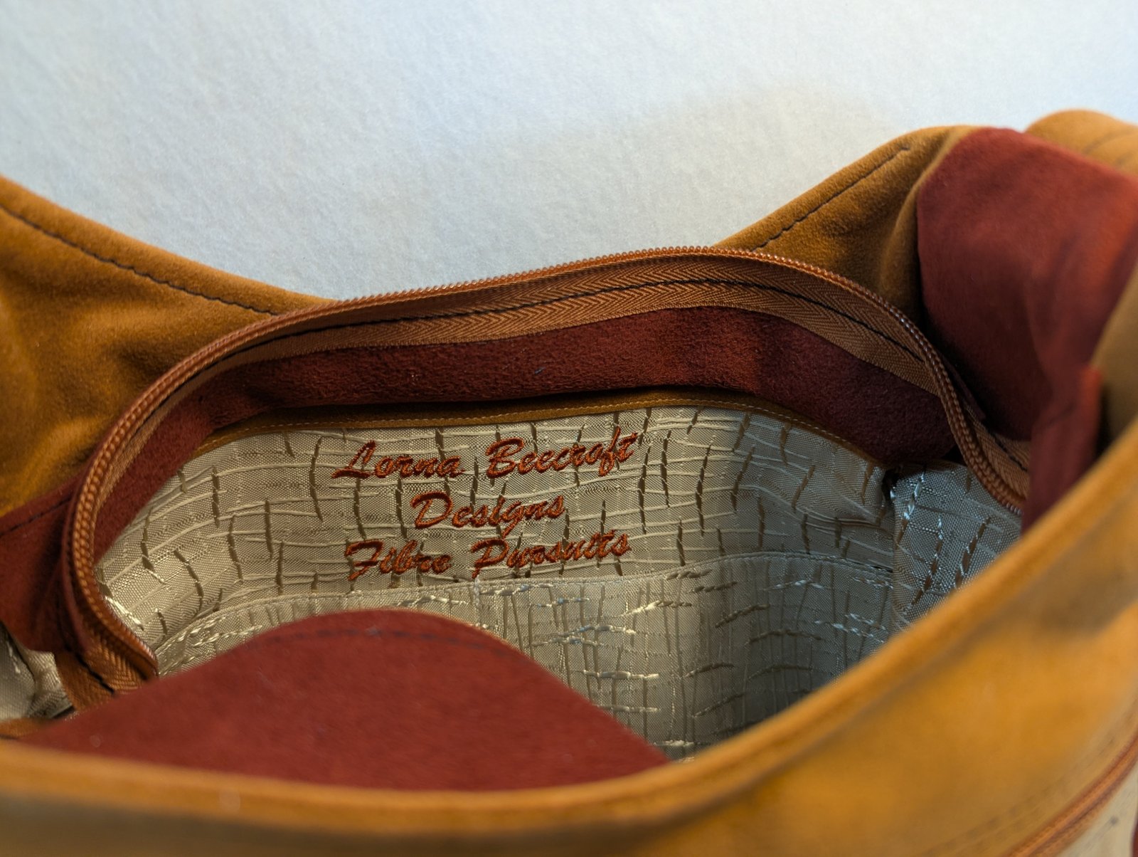 Crafted with a premium ultrasuede exterior and a unique lining, this bag has a soft, tactile finish and a strong handmade presence. Its design suggests shifting light, movement through grasses, and the quiet warmth of an ember trail winding through a changing landscape.
